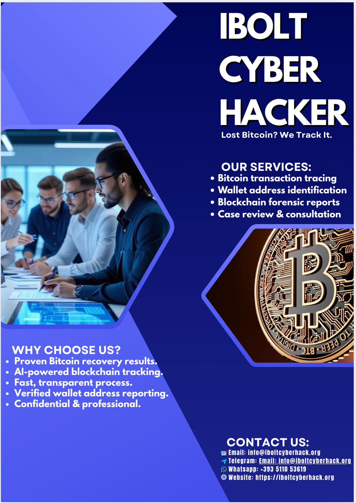 Quote from Jerry Matuda on January 21, 2026, 11:58 amAfter losing access to my Bitcoin, I felt completely stuck until I contacted iBolt Cyber Hacker Company. Their team was responsive, knowledgeable, and walked me through the recovery process step by step. What stood out most was their transparency and speed—they explained what was possible, set realistic expectations, and kept me updated throughout. I was able to recover my Bitcoin much faster than I expected. I highly recommend iBolt Cyber Hacker.